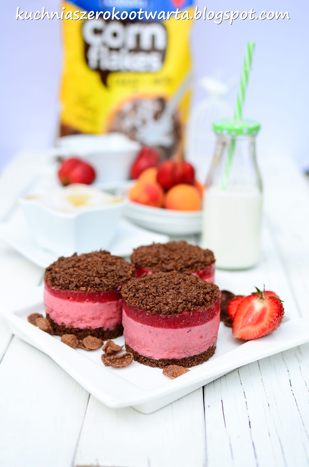 Płatki rozdrobnić w robocie lub w woreczku foliowym za pomocą tłuczka. Przesypać do miski, dodać miód i roztopione masło. Wymieszać. Pierścienie ułożyć na talerzu wyłożonym papierem do pieczenia. Do pierścieni wsypać po 2 łyżki płatków. Docisnąć do dna za pomocą dołączonego do zestawu elementu. Warstwa jogurtowo-truskawkowa: Truskawki umyć, osuszyć i usunąć szypułki zmiksować z miodem, dodać jogurt i dokładnie wymieszać. Żelatynę rozpuścić w gorącej wodzie, przestudzić i dolać cienką strużką do jogurtu z truskawkami, cały czas miksując. Na płatki wylać jogurt z truskawkami, włożyć na chwilę do lodówki, do lekkiego stężenia.