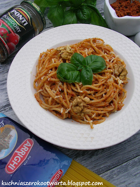 Dzisiaj będzie przepis na obiad w niecałe 15 minut. Pysznie i po włosku, bo z użyciem włoskich produktów, które jakiś czas temu dostałam do testowania. Muszę się Wam przyznać, że nigdy nie jadłam gotowego pesto rosso ze słoiczka, więc nie wiem jak smakuje, ale za to wiem, jak smakuje domowe pesto z suszonych pomidorów. Wybornie 🙂 Ten sos do makaronu możecie przygotować wcześniej i przechować go w słoiku w lodówce. Potem, w bardziej zabiegane dni wystarczy połączyć go z gorącym makaronem i macie obiad w kilka chwil. Co do samych suszonych pomidorów firmy Ponti – jestem szczerze zachwycona ich smakiem. Próbowałam już suszone pomidory wielu producentów, ale te są bez dwóch zdań najpyszniejsze – mięsiste i aromatyczne, takie prawdziwe! Spaghetti Arrighi jest sprężyste i idealnie gotuje się al dente. Ale inaczej być nie mogło, skoro zrobione jest z pszenicy durum 🙂 Zapraszam Was więc na pyszny obiad 🙂