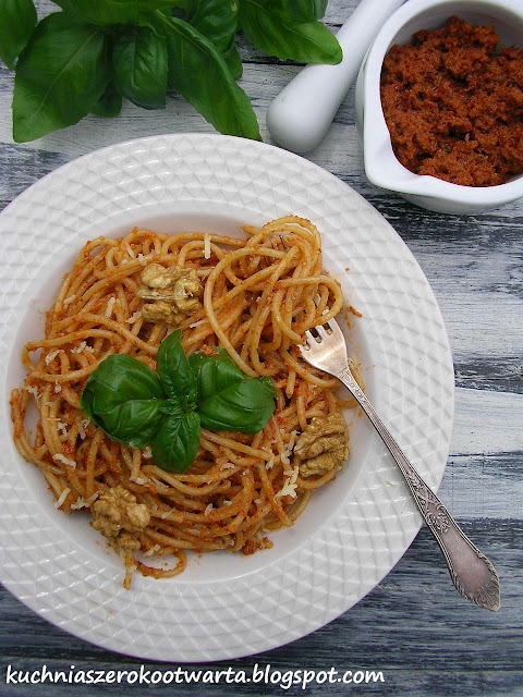 Pomidory odsączyć z oleju (olej zachować). Posiekać na mniejsze kawałki i wrzucić do naczynia. Dodać ser, bazylię, podprażone na suchej patelni i posiekane orzechy włoskie, posiekany czosnek i sól oraz mielone płatki chili. Wszystkie składniki zmiksować dolewając stopniowo olej z pomidorów.