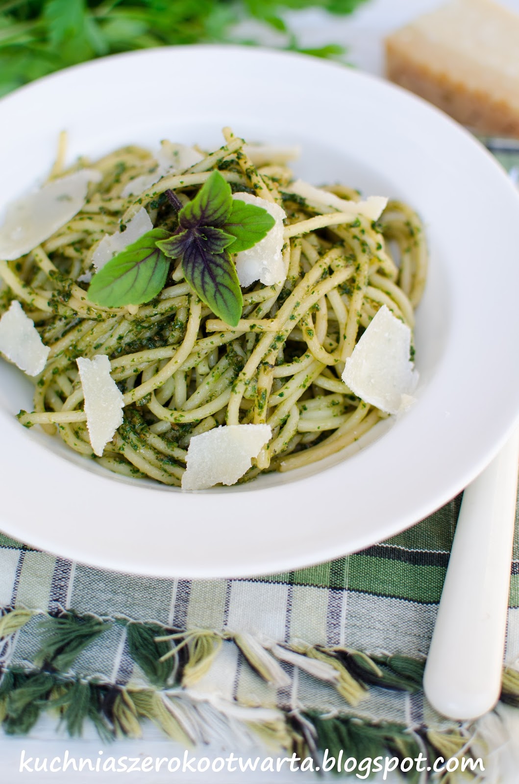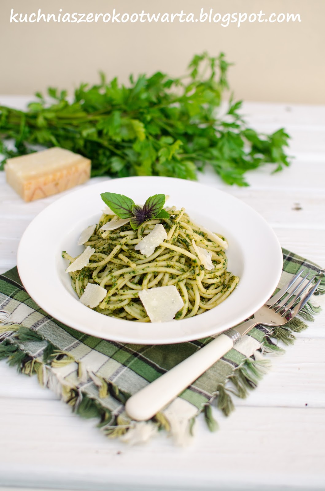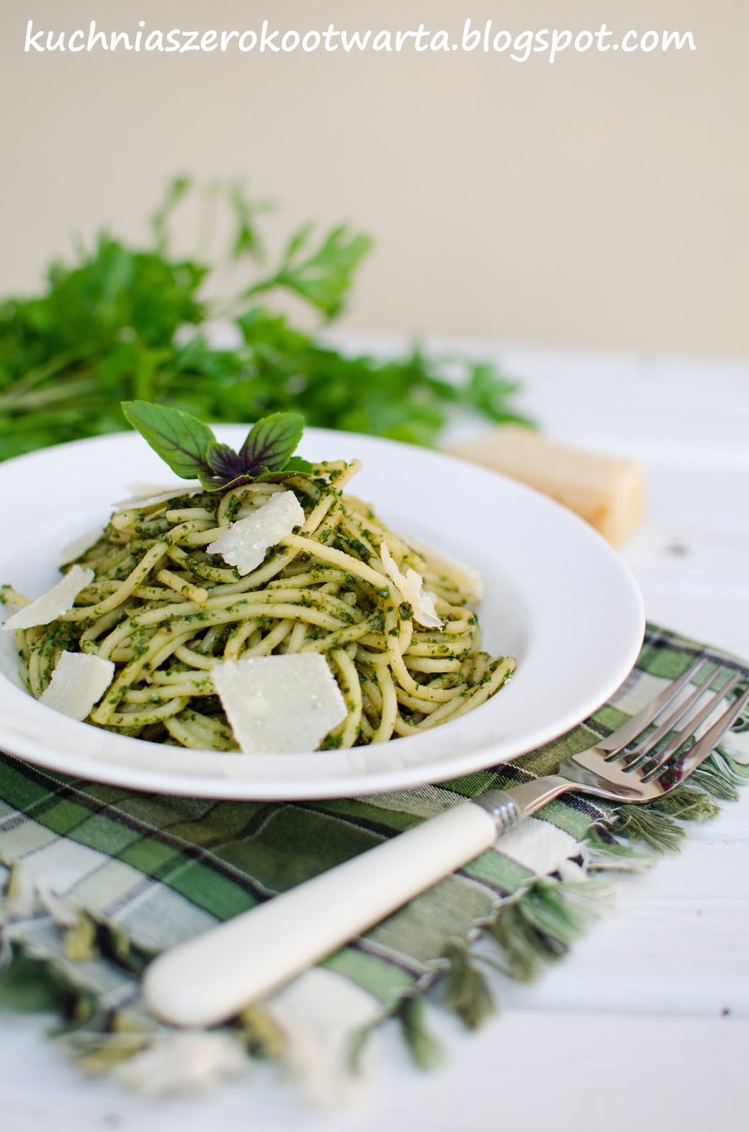 Jestem prawdziwą miłośniczką pesto. Robię je często wykorzystując to, co akurat mam pod ręką. Czasem są to listki aromatycznej bazylii czy rukoli prosto z przydomowego ogródka, czasem szpinak lub suszone pomidory. Tym razem do pesto wykorzystałam natkę pietruszki, która świetnie komponuje się z prażonym słonecznikiem i pikantnym serem grana padano. Dla mnie makaron z pesto, choć wygląda skromnie, jest jednym z najpyszniejszych obiadów, które mogłabym jeść nawet kilka razy w tygodniu.