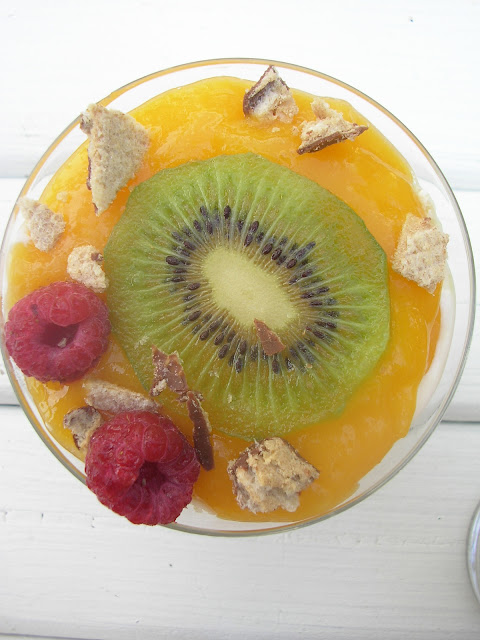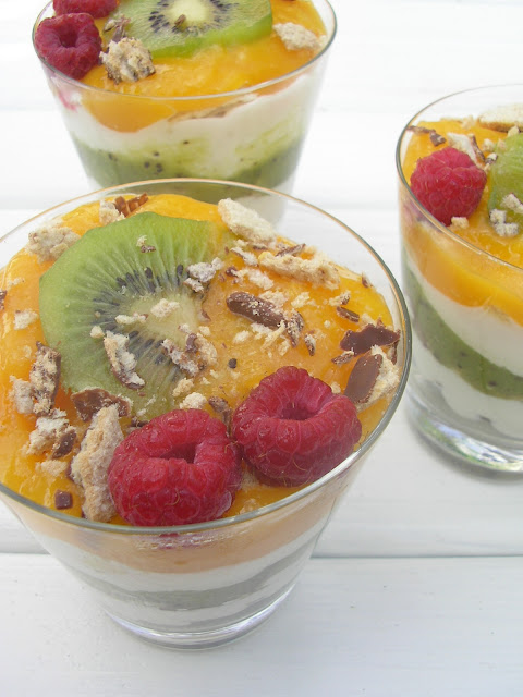 Mango obrać i usunąć pestkę. Zmiksować na pure. Kiwi obrać i również zmiksować. Jogurt dosłodzić cukrem pudrem. Wafelki pokruszyć na mniejsze kawałki. W szklankach lub pucharkach układać warstwami: wafelki, jogurt, wafelki, mus z kiwi, jogurt, mus z mango. Udekorować plasterkami kiwi, wafelkami i malinami. Smacznego!