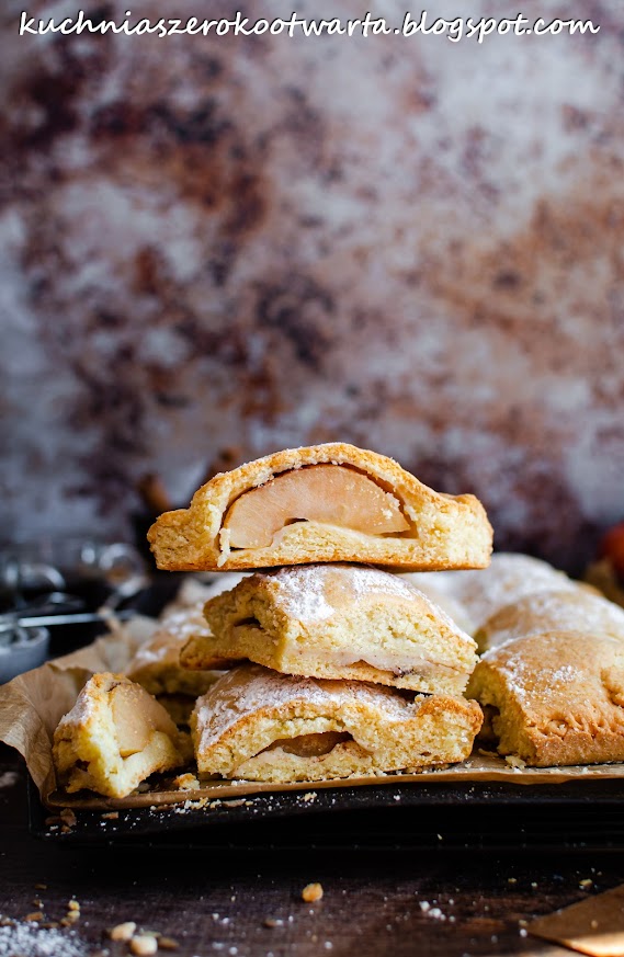 Składniki ciasta zagnieść ręcznie lub w robocie. Ciasto podzielić na dwie części. Jedna część ciasta powinna być nieco większa (o ok. 100 g). Większą część ciasta zawinąć w folię spożywczą i włożyć do lodówki do schłodzenia. Mniejszą część ciasta rozwałkować i wyłożyć dno formy, wyłożonej papierem do pieczenia. Ciasto kilkukrotnie nakłóć widelcem. Formę z ciastem wstawić do lodówki do schłodzenia. Jabłka obrać, pokroić na połówki i wykroić gniazda nasienne. Ułożyć na cieście wypukłą częścią do góry. Jabłka posypać cynamonem i cukrem. Drugą, schłodzoną część ciasta rozwałkować na wymiar nieco większy niż forma. Ułożyć na jabłkach i zlepić brzegi. Ciasto nakłóć widelcem. Piec w piekarniku nagrzanym do 180 stopni (grzałka góra-dół) przez około 50 minut, do zarumienienia. Ciepłą szarlotkę posypać cukrem pudrem. Smacznego!