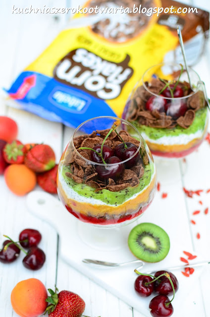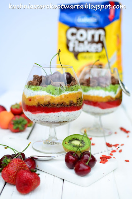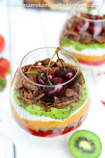 Dwie szklanki płatków rozdrobnić z mikserze lub za pomocą tłuczka. Jogurt wymieszać z miodem, dodać chia i odstawić na ok. 10 minut do napęcznienia nasion. Owoce umyć i osuszyć. Z truskawek usunąć szypułki, z kiwi obrać skórkę. Morele i nektarynki zmiksować razem na gładkie pure. Truskawki i kiwi zmiksować osobno. W szklankach lub pucharkach układać naprzemiennie płatki, jogurt, pure z truskawek, płatki, pure z nektarynki i moreli, jogurt i pure z kiwi. Na wierzchu posypać pozostałą szklanką niepokruszonych płatków i udekorować czereśniami. Smacznego!