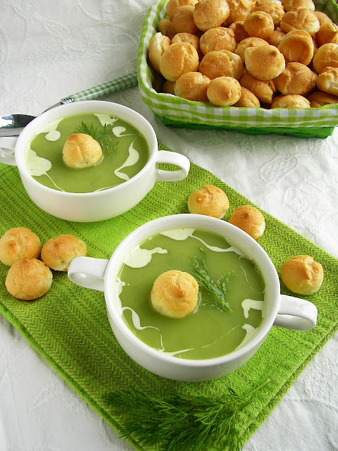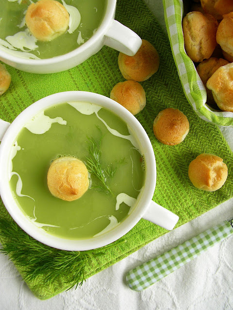 Jedna z moich ulubionych zup – krem z zielonego groszku. Bajeczny kolor tej zupy świetnie poprawia nastrój i dodaje energii. W sezonie robię go ze świeżego groszku z ogródka. Poza sezonem świetnie sprawdzi się groszek mrożony. Tę zupę najczęściej podaję z gotowym groszkiem ptysiowym, ale dziś postanowiłam zrobić go sama. Jeśli wolicie bardziej sycącą wersję do zupy możecie dodać jednego dużego ziemniaka, a krem podać z ugotowanym na twardo jajkiem. W każdym wydaniu będzie smakować pysznie.