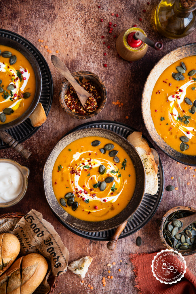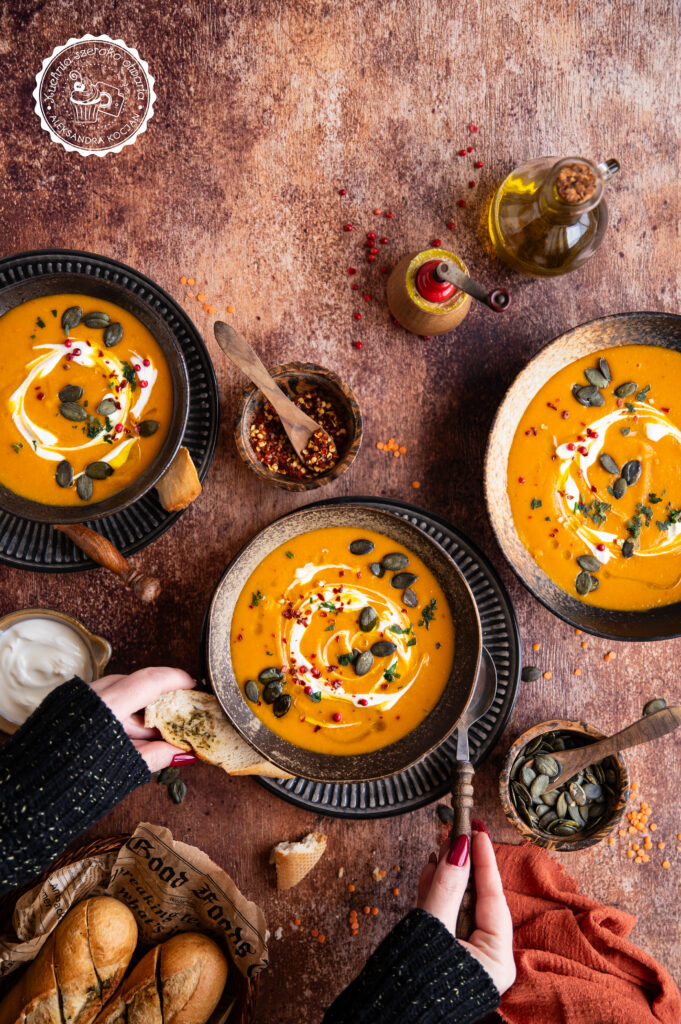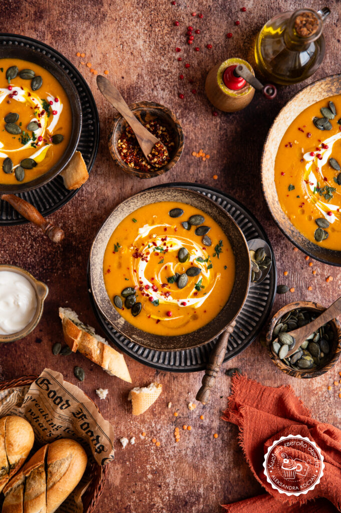 Rady: Jeśli wolisz mniej gęste zupy możesz dodać więcej bulionu. Dyni hokkaido nie trzeba obierać ze skórki, jeśli używasz innej odmiany, obierz ją przed użyciem.