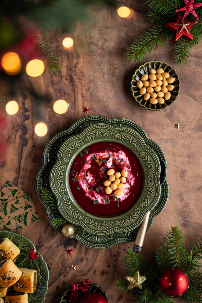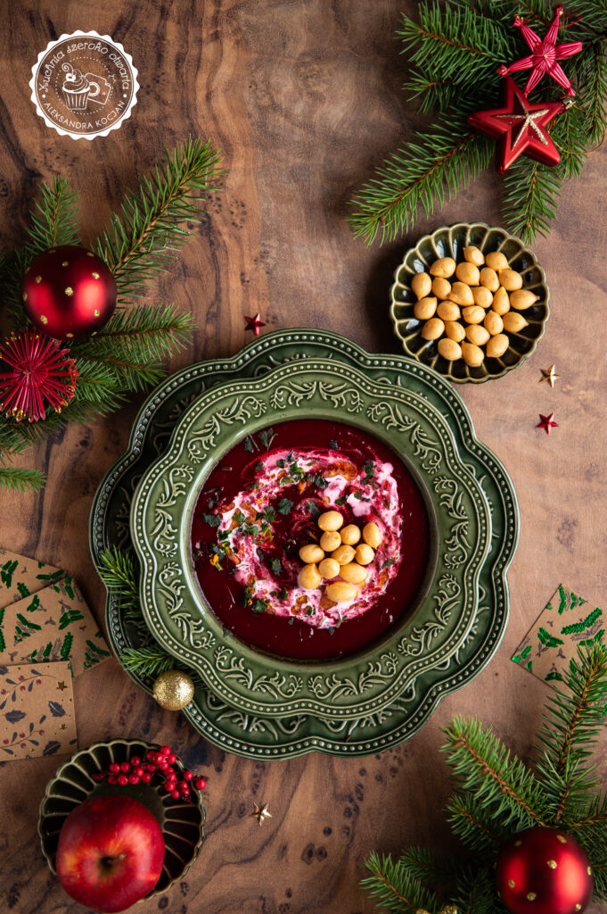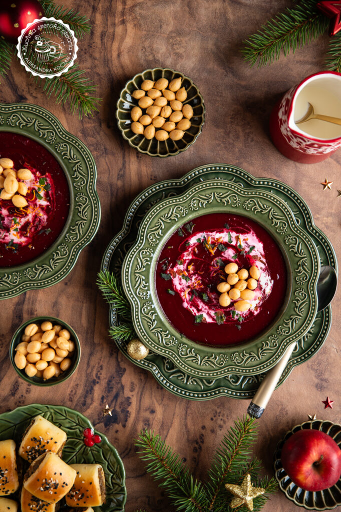 Kremowa, słodka, pełna aromatu, o pięknym głębokim kolorze zupa krem z buraka z dodatkiem jabłka i pomarańczy to świetna alternatywa dla klasycznego, świątecznego barszczu czerwonego. Zrobisz ją z zaledwie kilku składników, a smak z pewnością Cię zaskoczy. Idealnie smakuje wykończona słodką śmietanką, natką pietruszki i skórką z pomarańczy. Możesz podać ją z groszkiem ptysiowym, kapuśniaczkami, grzankami lub nawet z jajkiem na twardo.
