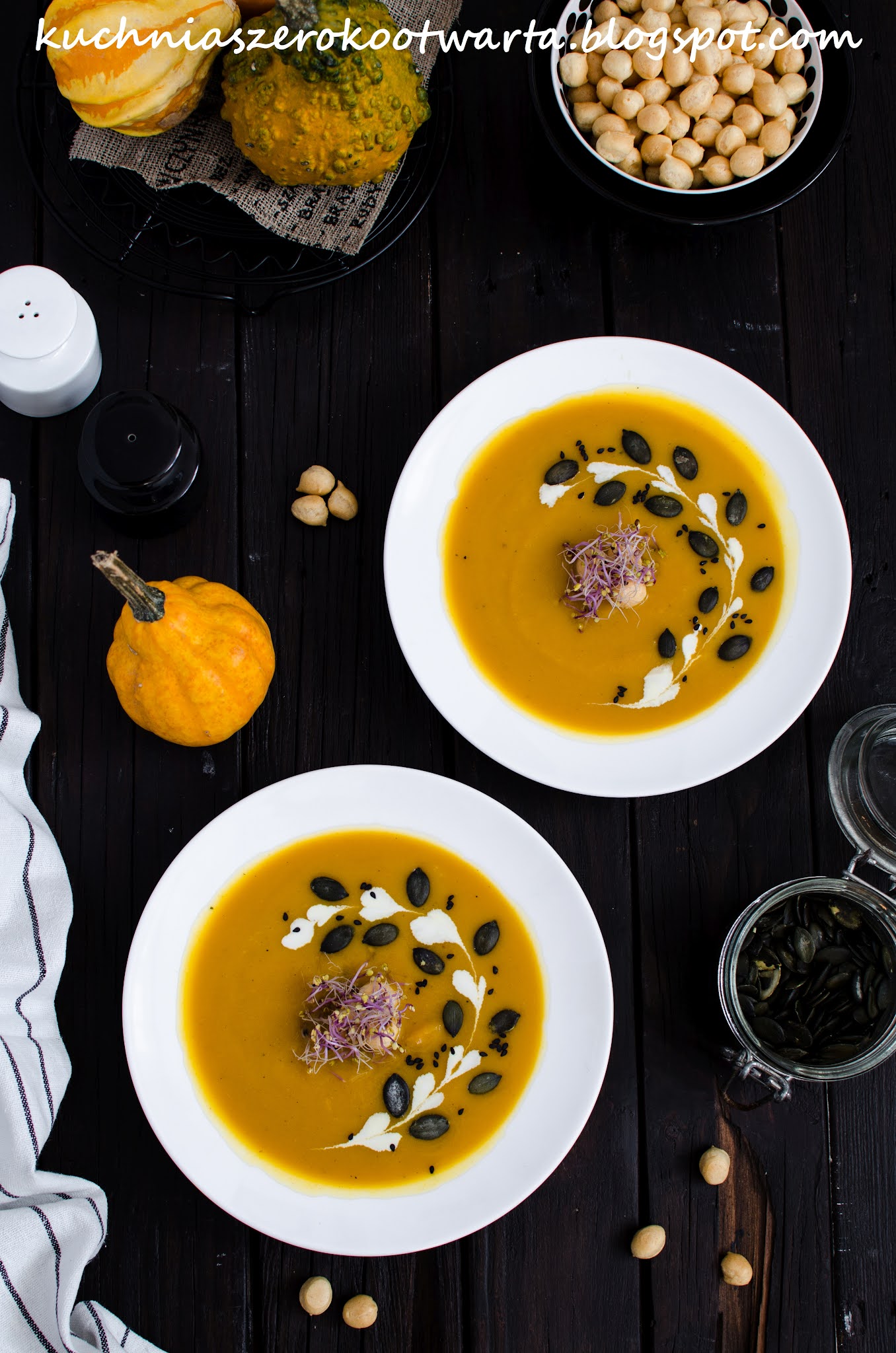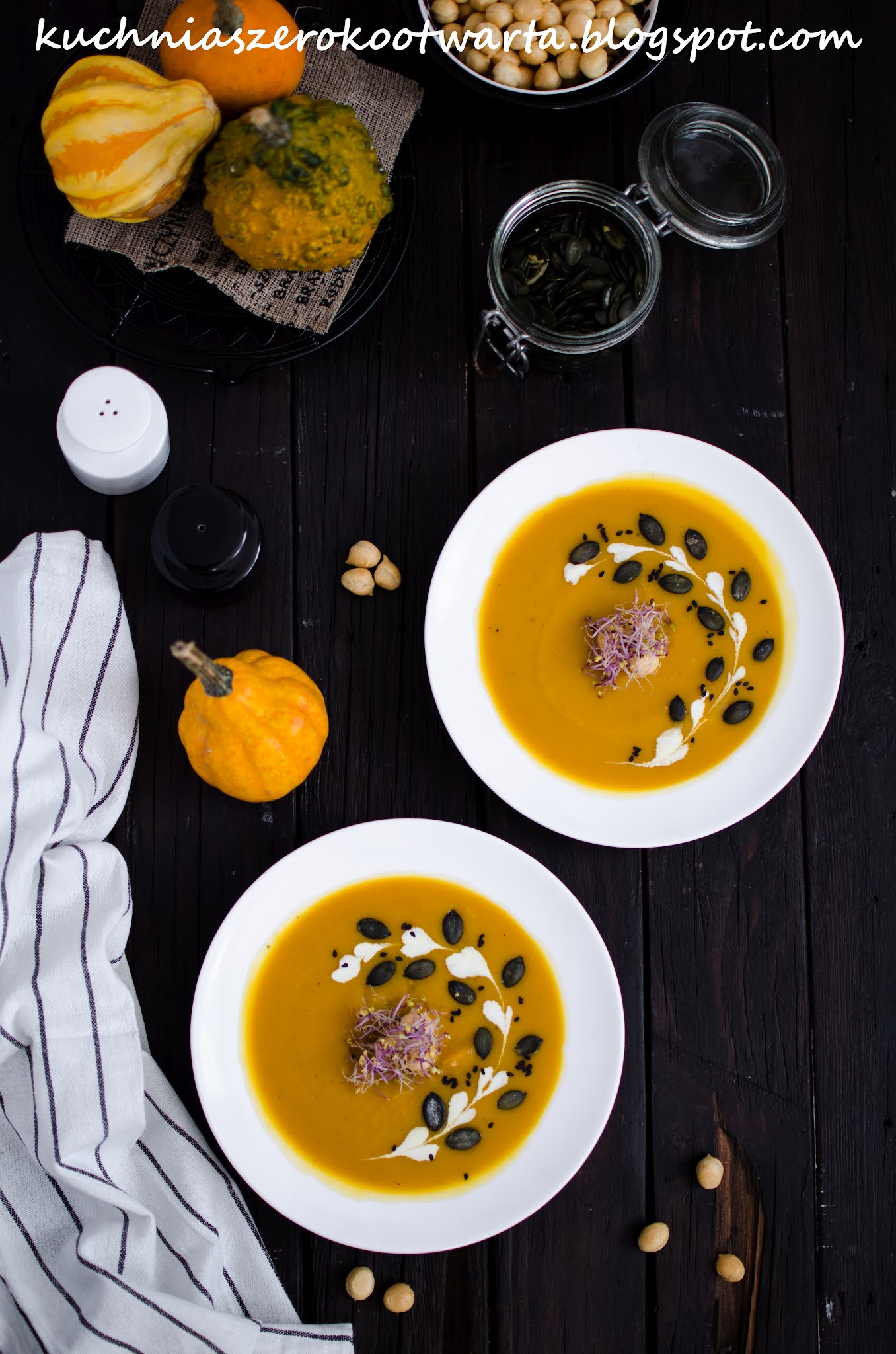 W garnku na maśle i oleju zeszklić drobno posiekaną cebulę i czosnek. Dodać obrane i pokrojone w kostkę bataty, pokrojoną w kostkę dynię oraz marchewkę pokrojoną na plasterki. Wsypać przyprawy: curry, kurkumę, gałkę muszkatołową i krótko podsmażyć mieszając. Wlać bulion lub wodę i gotować na wolnym ogniu, aż warzywa będą miękkie. Zupę zmiksować na gładki krem i doprawić solą i pieprzem. Podawać gorącą ze śmietaną, groszkiem ptysiowym, kiełkami, sezamem i pestkami dyni. Smacznego!